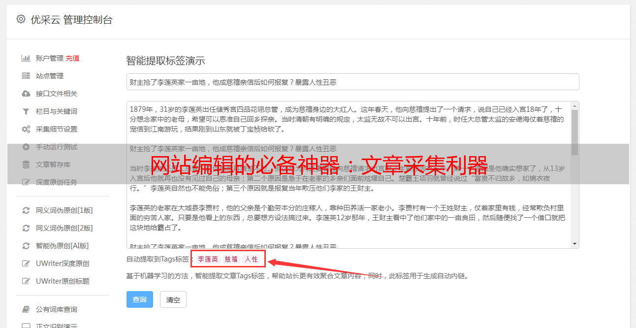 10.高效节省时间:有了这款文章采集工具,你不再需要花费大量时间去搜索、筛选文章素材,只需轻松点击几下,就能获取到大量高质量的内容,让你的创作事半功倍!