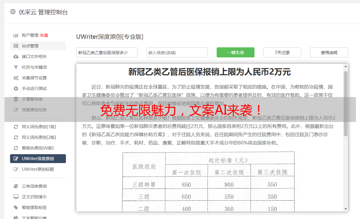 优采云 发布时间: 2023-09-16 19:34本文将向大家介绍一款令人振奋的工具——文案AI,它不仅能够帮助我们轻松撰写吸引人的文案,还能提供个性化的创意和优化方案。让我们一起来看看它的魅力所在吧!