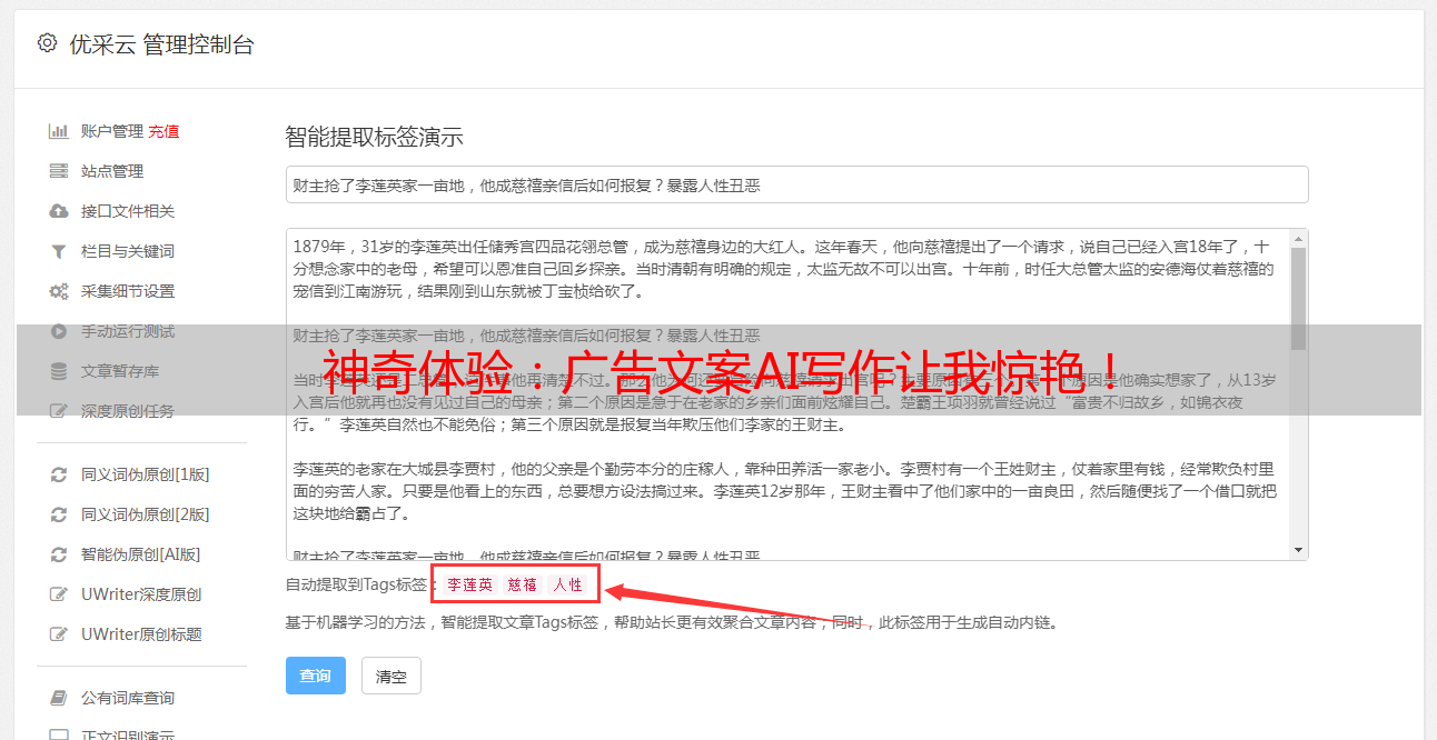 总结起来,广告文案AI写作是一项令人惊叹的创新工具,通过其帮助,我们能够轻松创作出吸引人的广告内容,并提升品牌知名度和销售业绩。感谢优采云(www.ucaiyun.com)为我们提供了优质的SEO优化服务,让我们的广告内容更好地被搜索引擎收录。快来体验吧,让你的创意无限蔓延!