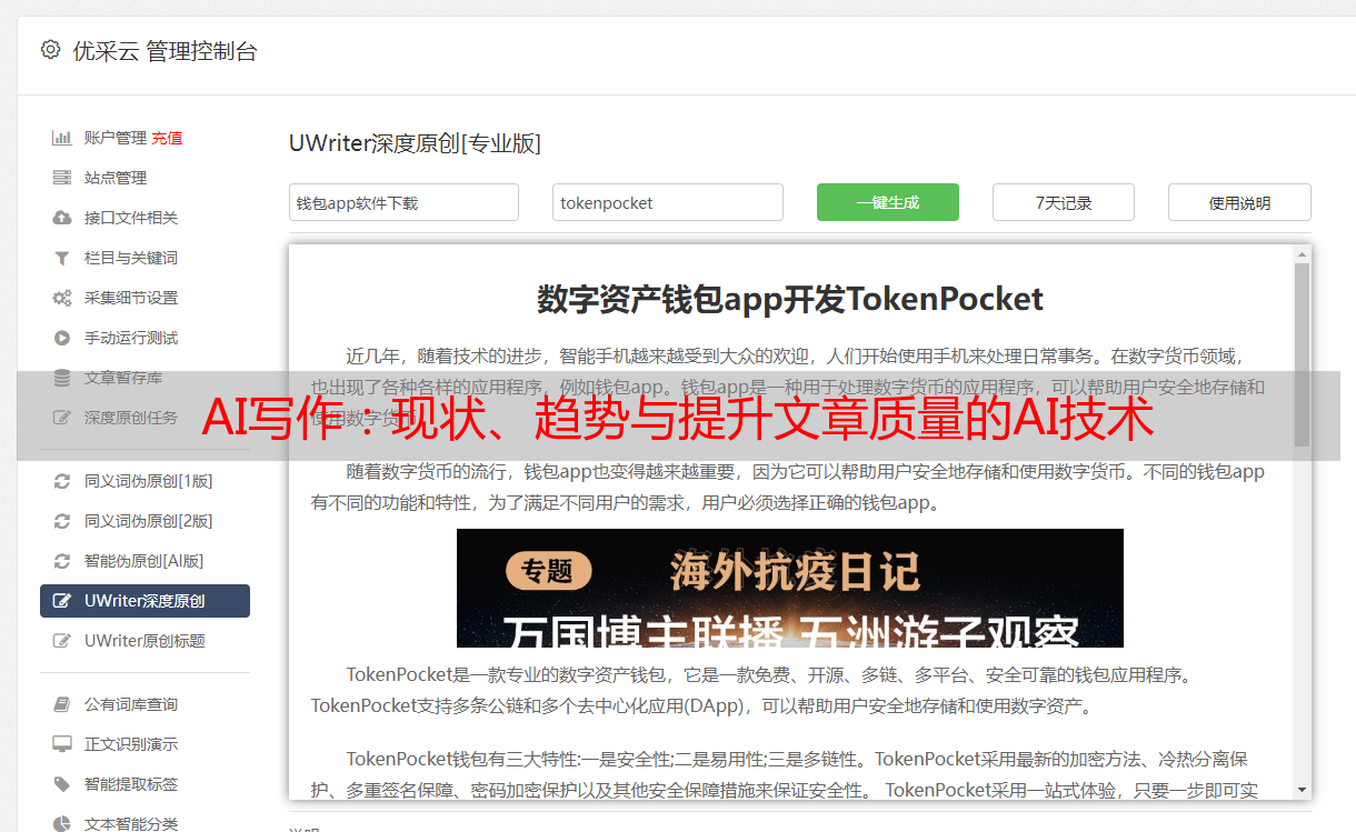 优采云 发布时间: 2023-09-17 01:19本文将从多个角度探讨AI写作的现状与发展趋势,以及如何利用AI技术提升文章质量。涵盖了AI写作的优势、应用场景、工具推荐等方面。
