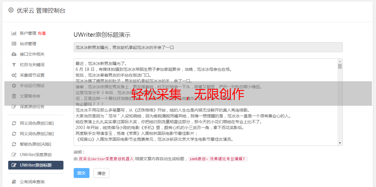 免费文章采集软件完全免费使用,没有任何隐藏收费项目。无论你是个人写手、博主还是企业编辑,都可以免费享受到它带来的便利和好处。不需要付出额外成本,就能轻松提升创作质量。