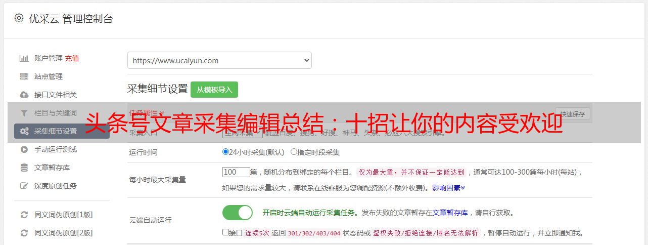 更多关于头条号文章采集的经验分享,欢迎大家访问优采云官网:www.ucaiyun.com。