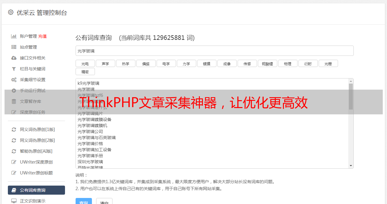 thinkphp文章采集系统是一款优采云旗下的SEO优化工具,旨在帮助用户快速有效地采集、整理和发布高质量的文章内容。通过该系统,用户可以轻松获取各类主题的文章,提升网站的内容质量和排名。