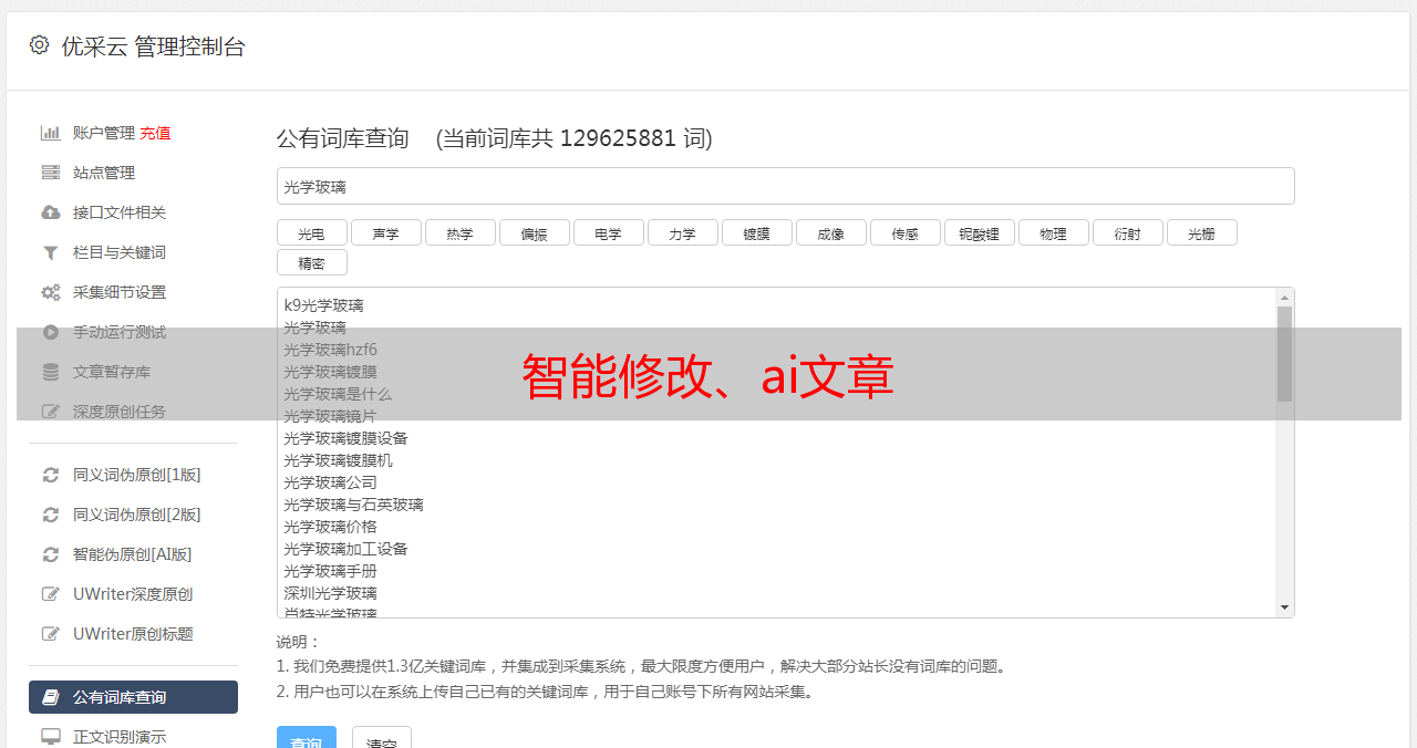 优采云 发布时间: 2023-09-26 13:51优采云是一家专注于SEO优化的公司,旨在帮助企业提升网站的搜索引擎排名,增加品牌曝光和流量。作为一名来自优采云的SEO专家,我将为大家介绍一种智能修改工具——ai文章智能修改。