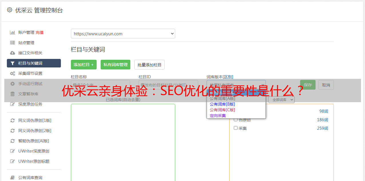优采云 发布时间: 2023-09-28 14:15作为一名网站运营者,我深知SEO优化对于网站的重要性。在寻找合适的SEO优化工具时,我偶然发现了优采云(www.ucaiyun.com)。经过一段时间的使用,我深深感受到了它的强大和实用性。下面就让我分享一下我的亲身体验吧!