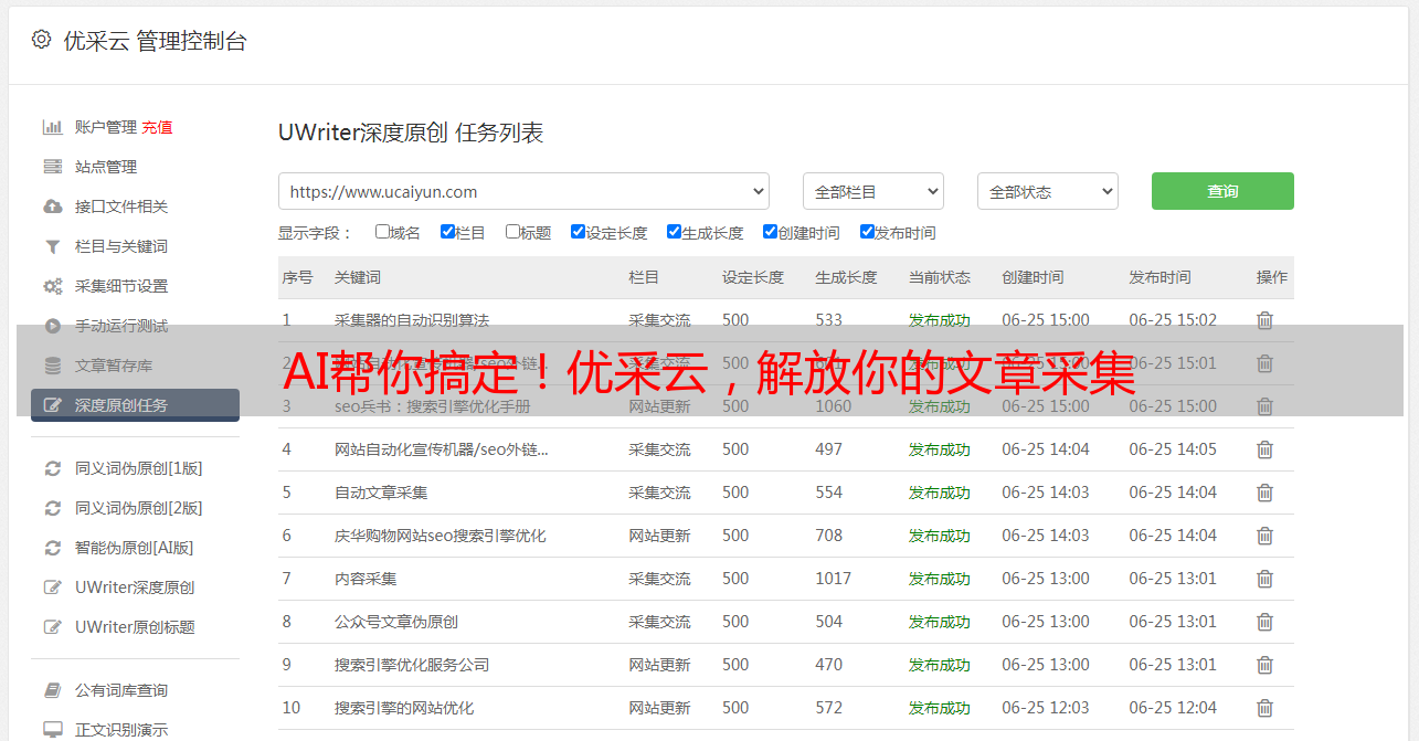 总之,优采云是一款功能强大、操作简便、性价比高的AI文章采集工具。它将为你节省大量时间和精力,助力你的网站SEO优化工作取得更好的效果。