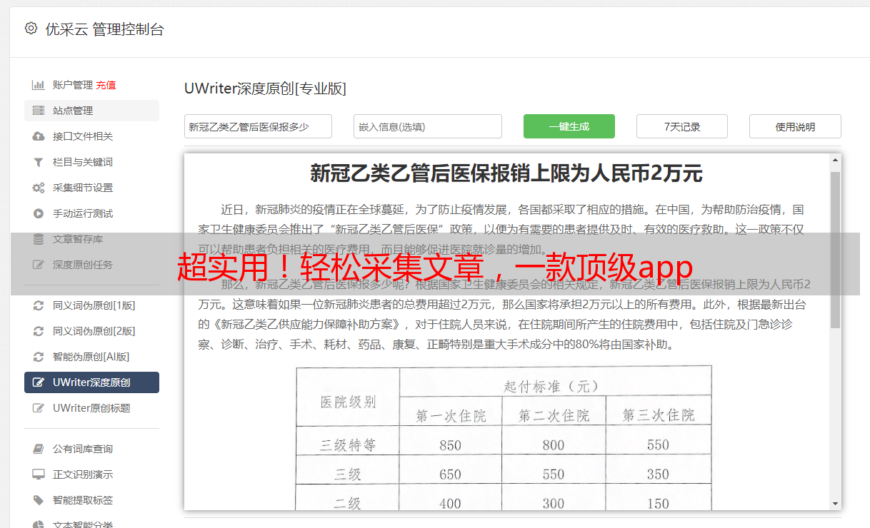 综上所述,优采云是一款功能强大、操作简便的采集文章软件app。它不仅能够帮助你快速采集文章素材,还能进行SEO优化,提升文章曝光度和影响力。无论你是职业写作者还是爱好者,都能从中受益匪浅。