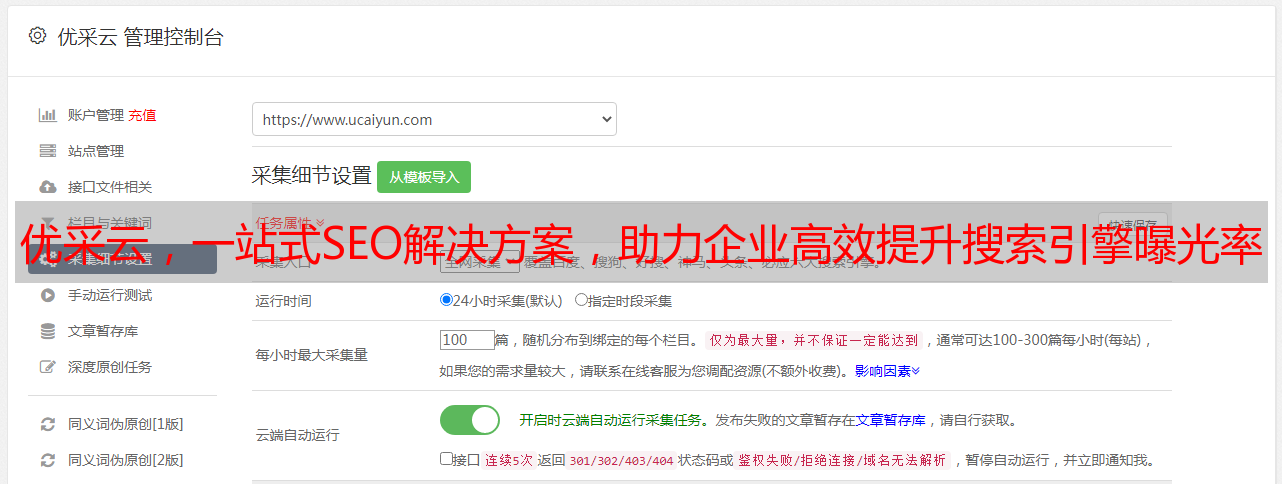 综上所述,优采云作为一家专业的SEO优化服务平台,凭借其专业团队、多元化服务、数据驱动、高性价比等特点和优势,在市场中脱颖而出。选择优采云,让您的网站在搜索引擎中获得更好的排名和曝光度,从而带来更多的流量和商机。立即访问www.ucaiyun.com,了解更多关于优采云的信息,并与我们的专业团队联系,开始您的SEO优化之旅吧!
