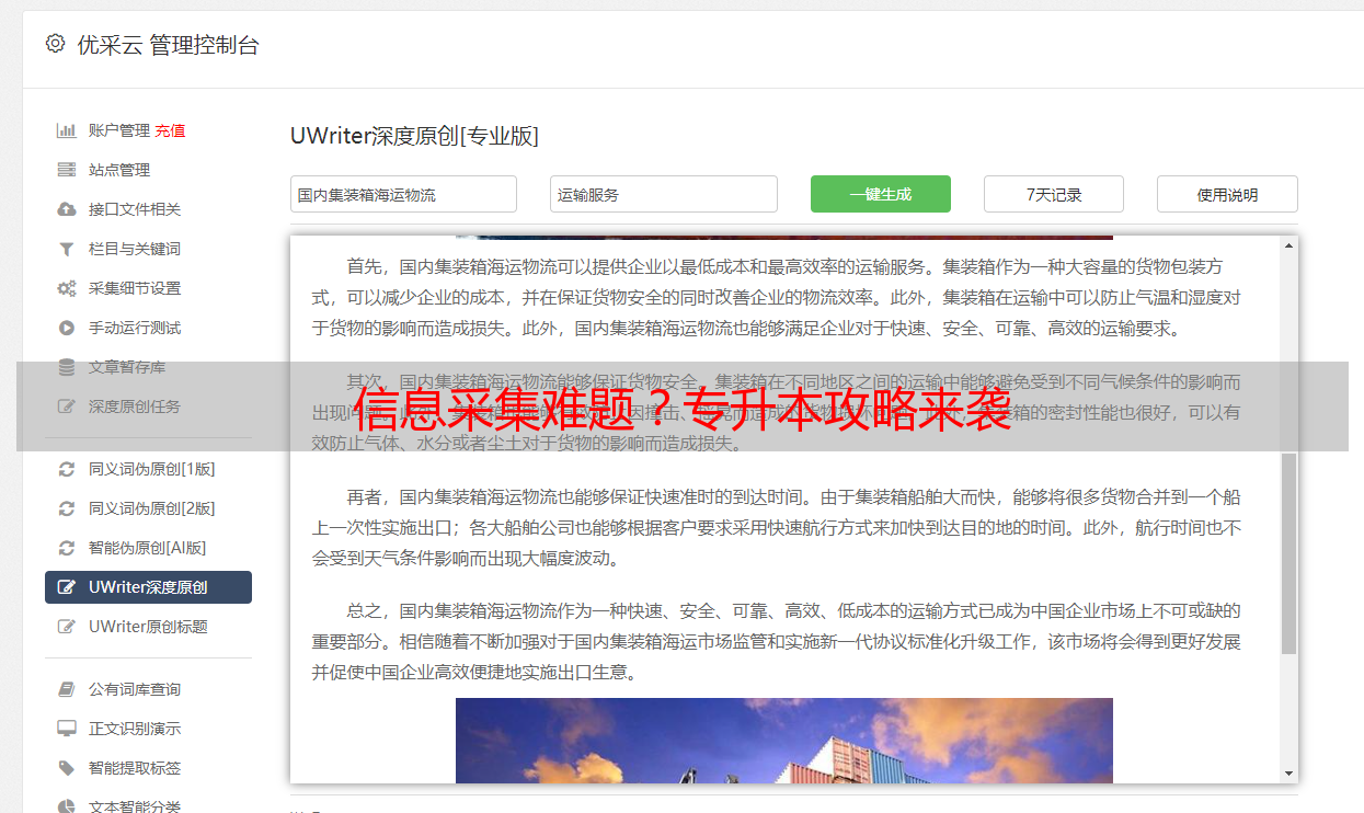 优采云在信息采集的过程中,对于每一条信息都进行了严格的筛选和评估。它通过多种手段来判断信息的真实性和可信度,并将高质量的信息优先呈现给用户。这样,用户就可以更加放心地使用这些信息来支持他们的工作和决策。