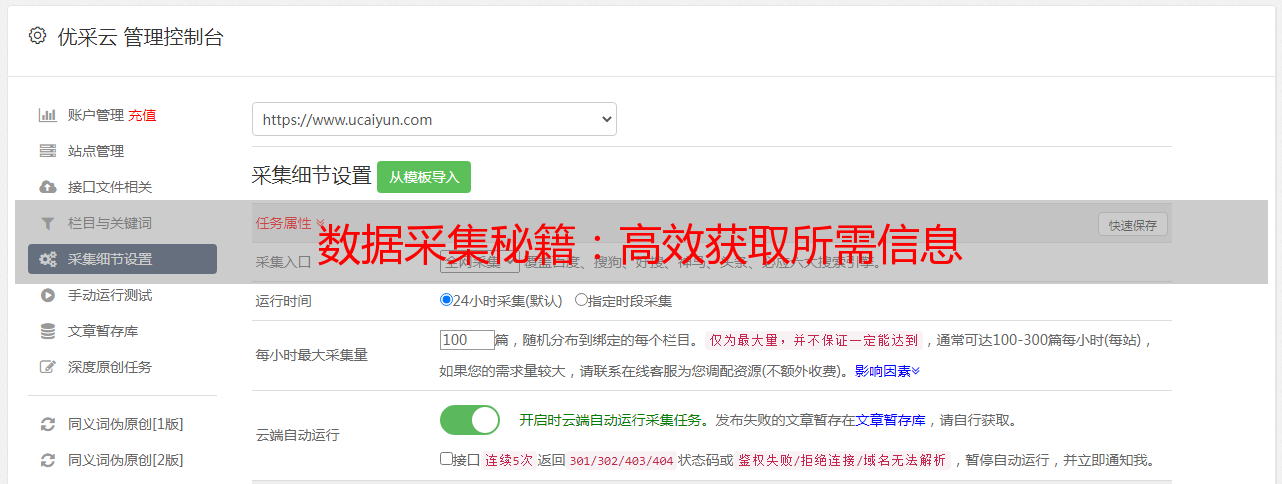 优采云不仅能够帮助用户快速获取数据,还提供了丰富的数据处理功能。用户可以通过优采云进行数据清洗、去重、格式转换等操作,使得采集到的数据更加规范和可用。此外,优采云还支持与其他数据分析工具的无缝对接,方便用户进行进一步的数据分析和应用。