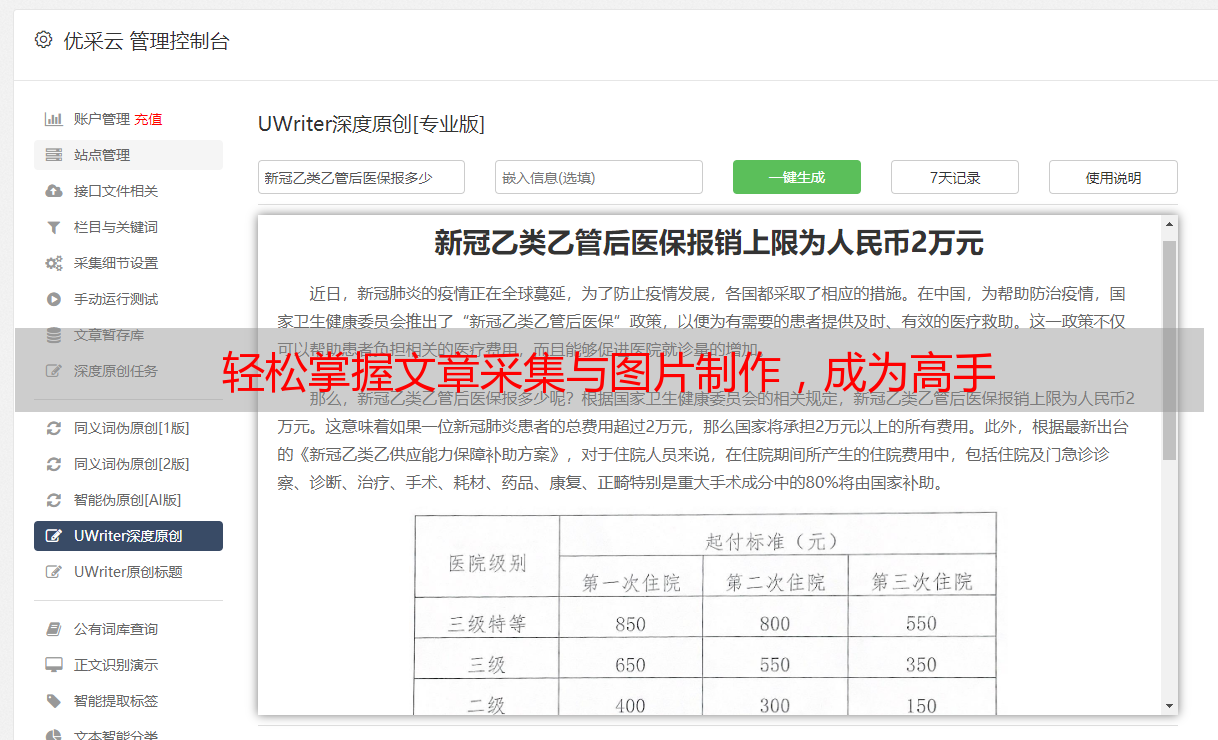 在写作过程中,一张精美的图片可以起到画龙点睛的作用。然而,找到合适的图片并不容易。优采云提供了一个强大的图片采集功能,它可以通过关键词快速搜索到与你文章主题相关的高质量图片。你只需输入关键词,优采云就能为你展示大量符合要求的图片供你选择。