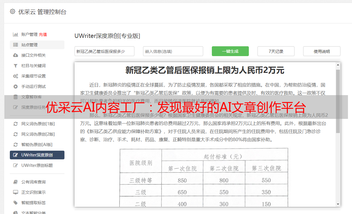 优采云AI内容工厂是一家专注于提供AI辅助写作服务的平台,为用户提供全方位、高效便捷的写作体验。在众多的AI文章创作网站中,优采云AI内容工厂以其独特的优势脱颖而出。