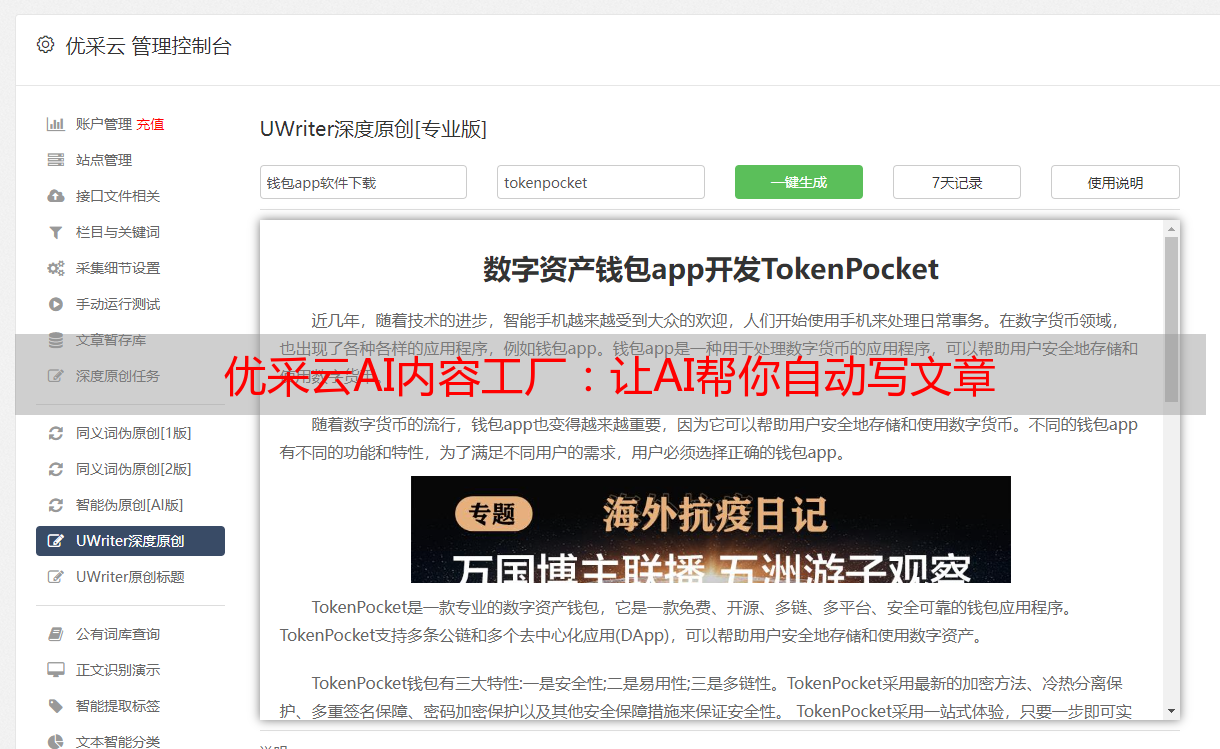 优采云AI内容工厂是一款强大的人工智能辅助写作工具。它通过智能算法和自然语言处理技术,帮助用户快速生成高质量的文章内容。无论你是写作新手还是资深作者,优采云AI内容工厂都能满足你的需求。
