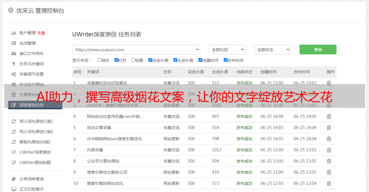优采云AI内容工厂凭借先进的人工智能技术,能够自动生成多样化、富有创意的烟花文案。无论是想要温馨感人还是搞笑幽默,只需简单输入关键词,优采云AI内容工厂就能为您量身定制出令人惊艳的文案。