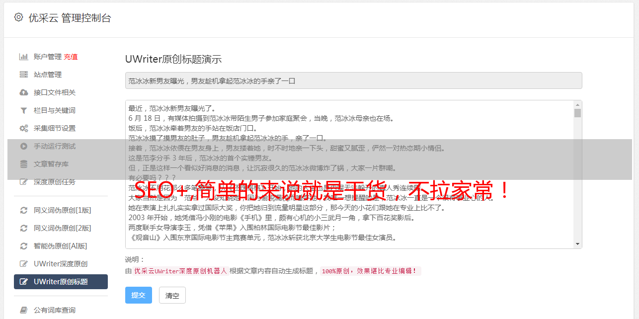 需要说明的是,为了保证我们网站内容的原创degree,我们CRAZYSEO工程师建议你在百度搜索引擎收录之后做一篇文章文章,然后发这个文章今日头条等其他一些平台。发布内容时,也可以在内容底部标注文章的出处。