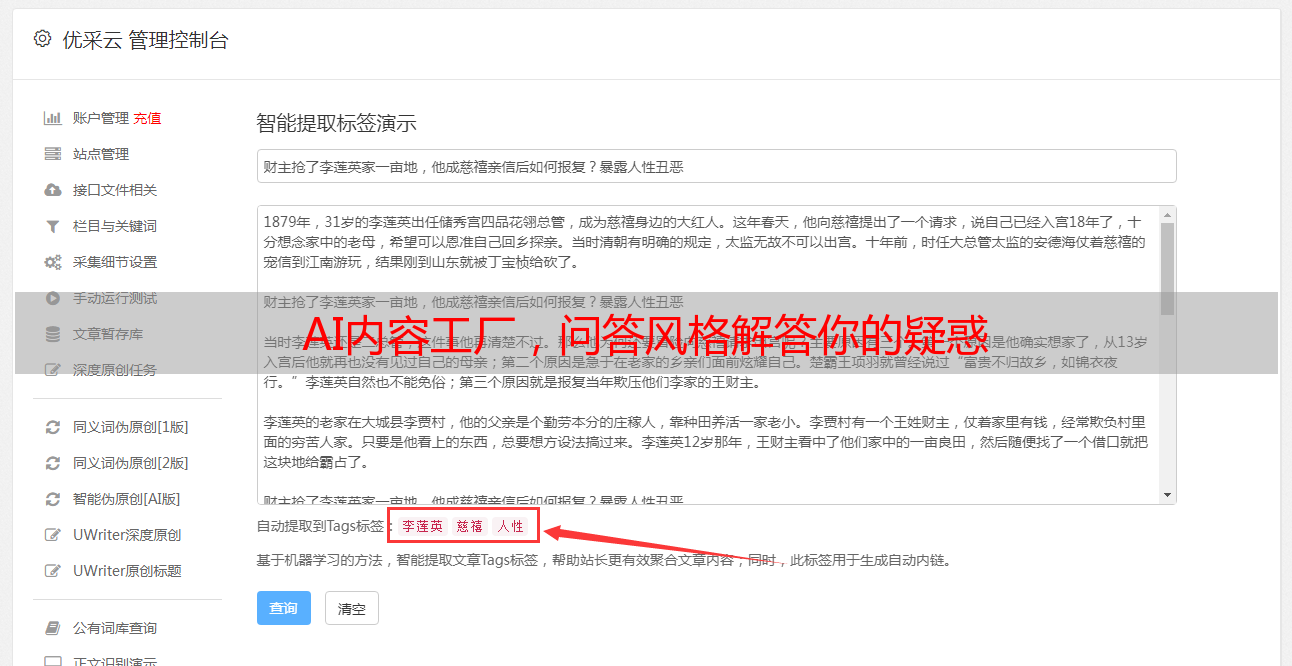 优采云AI内容工厂是一款强大的智能写作工具,它以问答风格的形式为你解答疑惑。无论你是学生、教师还是职场人士,无论你是需要写论文、博客还是新闻稿,它都能够帮助你轻松完成。相信通过使用优采云AI内容工厂,你将能够提高写作效率,创作出更加精准、有深度的文章。快来体验吧!