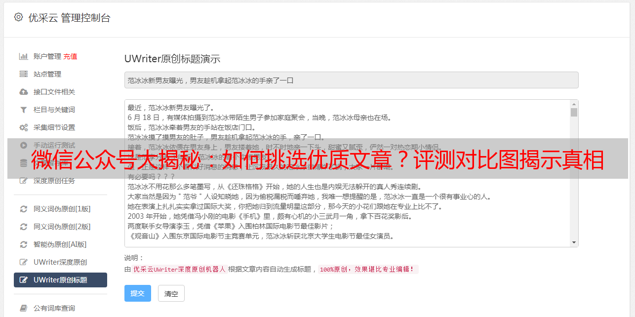 优采云 发布时间: 2023-11-21 15:29微信公众号已经成为了人们获取信息、娱乐和交流的重要渠道。在这个庞大的平台上,不同的公众号涌现出各种各样的文章,我们该如何选择和评估它们呢?本文将从多个角度进行评测对比,帮助你更好地利用微信公众号。