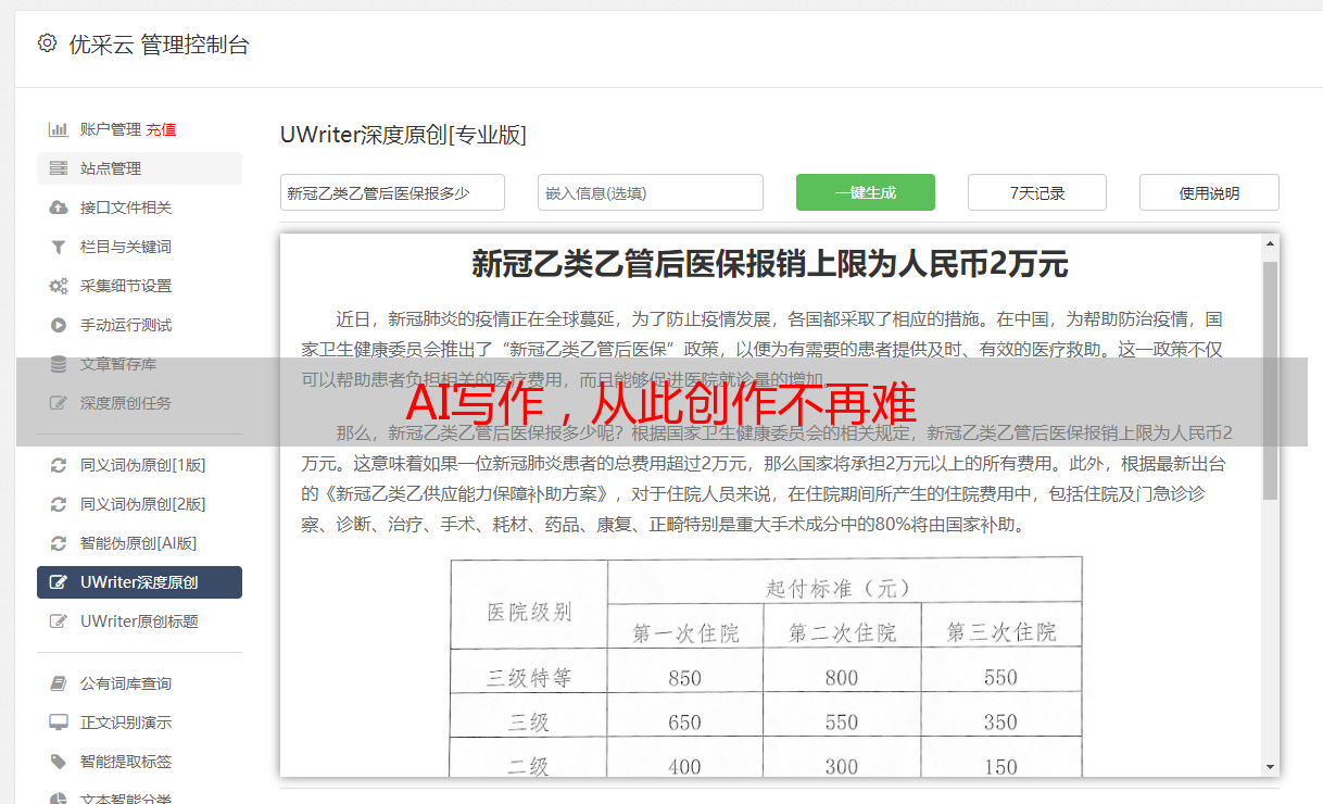 总之,优采云AI内容工厂是一款革命性的写作工具,通过强大的创作能力、丰富多样的文体风格、自动化生成与人工智能辅助等特点,帮助用户轻松创作高质量文章。无论您是从事新闻媒体行业还是个人博客写作,它都能成为您不可或缺的助手。