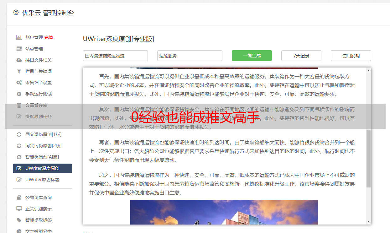 优采云AI内容工厂提供了简洁直观的界面,让你轻松上手。只需输入主题和关键词,即可生成一篇精彩纷呈的推文。不需要任何写作经验,也不需要花费大量时间和精力。
