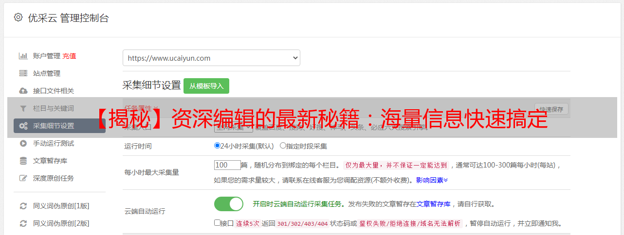 优采云 发布时间: 2023-12-11 17:22在这个信息爆炸的时代,我们每天都要面对海量的信息,如何快速准确地获取我们所需的内容成为了一项挑战。作为一名资深编辑,我曾经苦于需要手动搜集各种资料、新闻和文献,而且还要花费大量时间整理和筛选。然而,自从使用了优采云AI内容工厂的文章采集网站更新程序,我的工作变得轻松愉快。