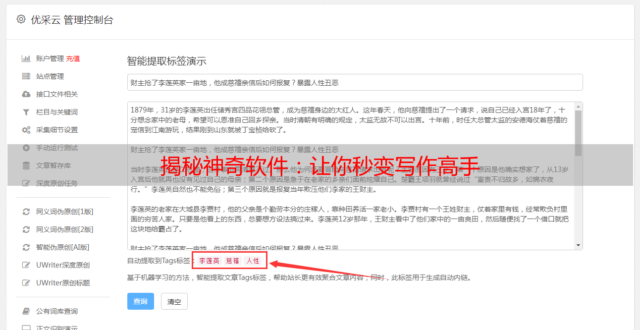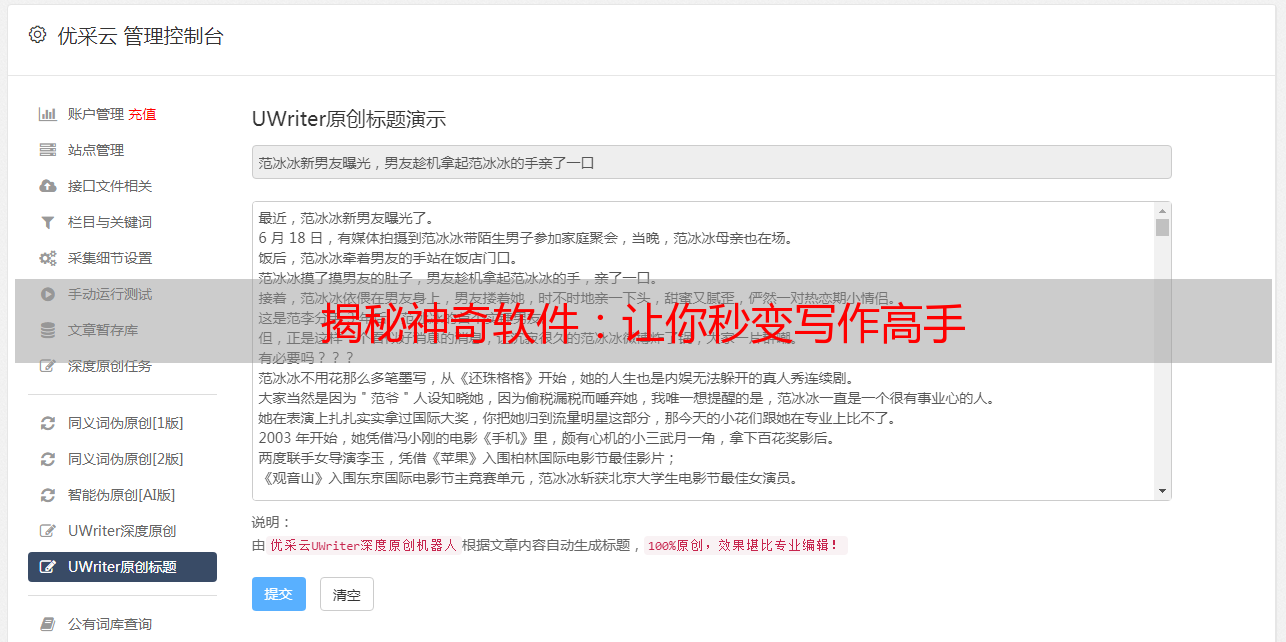 优采云 发布时间: 2023-12-26 15:27身为一位频繁书写文章的网络作家,繁多写作任务经常让我遇到了灵感匮乏的困扰。但是近期,我发现一款奇妙的工具——文章采集生成伪原创软件,这给我幸遭遇新体验。