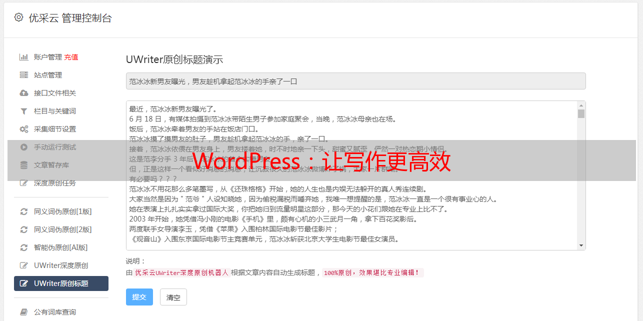 优采云 发布时间: 2023-12-26 18:50身为主人公,我深感荣幸,能够为您推荐这款高效实用的文章采集工具——WordPress。本篇文章旨在详细地从七大部分向您描述,我是如何通过WordPress大大提升了自己的写作效率的。
