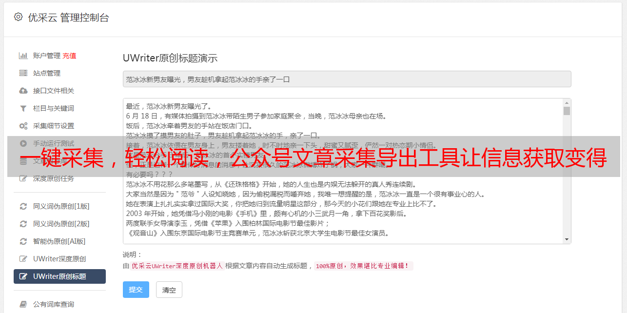优采云 发布时间: 2023-12-27 03:50本文向您推荐一种便捷高效的方式——通过使用公号文章采集导出工具,让您轻而易举地掌握最新信息。无需手动逐个关注公共号,也不必费力翻看每篇微信推送文,仅需简单点击操作,即可一键将文章内容自动导出至电脑或手机,无论何时何地都能畅享阅读之乐。接下来,我们将详细讲解该工具的使用流程及注意事项。