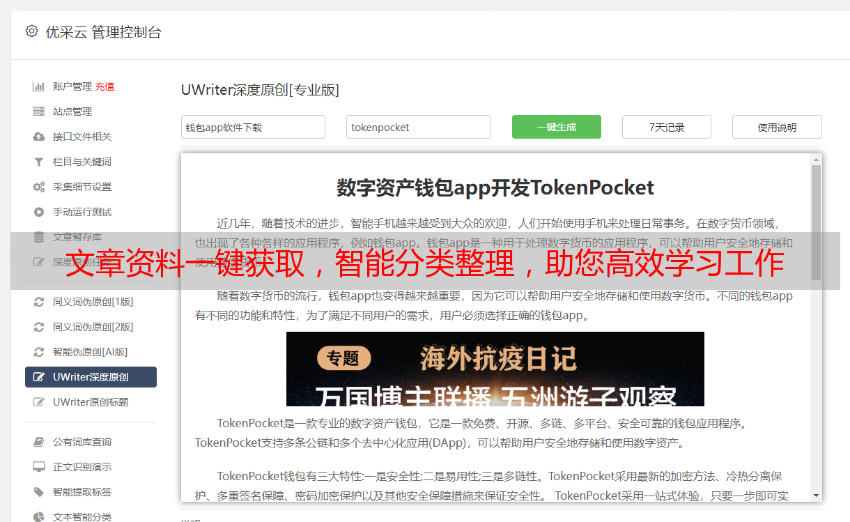 优采云 发布时间: 2023-12-27 15:52尊敬的用户,这款文献采摘工具,是您在学习、教学及工作中收集和整理大量文章资料的贴心助手。我们诚挚地推荐给所有需要便捷与高效的小伙伴们。