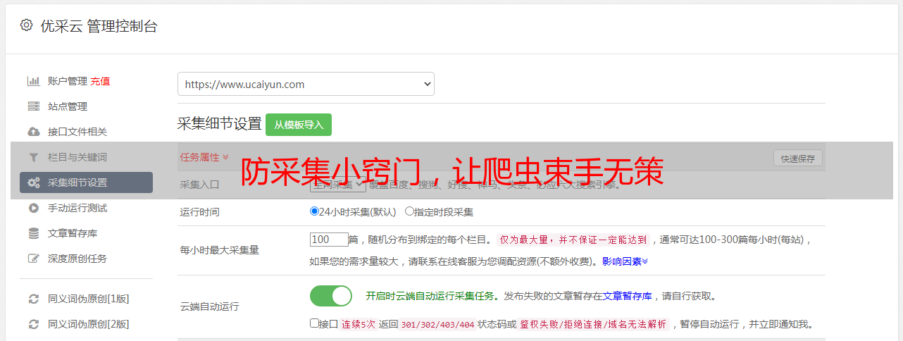优采云 发布时间: 2023-12-30 02:35"防止采集"在现今互联网环境下是至关重要的话题,其中各种信息与数据均为珍贵资产。然而,因为互联网具备的开放便捷特性,也为某些不法份子提供了可乘之机,通过各种方式来获取他人的隐私及*敏*感*词*。因此,为了保护个人隐私以及数据安全,我们有必要学会并巧妙运用防御措施。在此,我们将会揭示你可能未知的防采集小窍门。