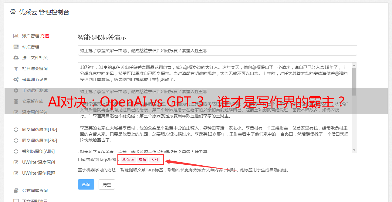优采云 发布时间: 2024-01-01 16:54科技日新月异,近年来人工智能技术备受推崇,其中AI写文章系统更是以其独特魅力引发广大关注。本文我有幸对比评测两家业界翘楚AI写文章系统——OpenAI与GPT-3,力求全面分析它们的独特优势及其不足。