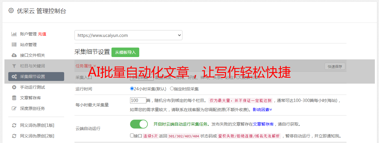 优采云 发布时间: 2024-01-02 07:24AI批量自动化文章堪称写作利器!它助您迅速完成海量文章创作,令您在写作过程中更富效率。接下来,请允许我为大家简要介绍一下这一技术的功能以及其带来的便利性。