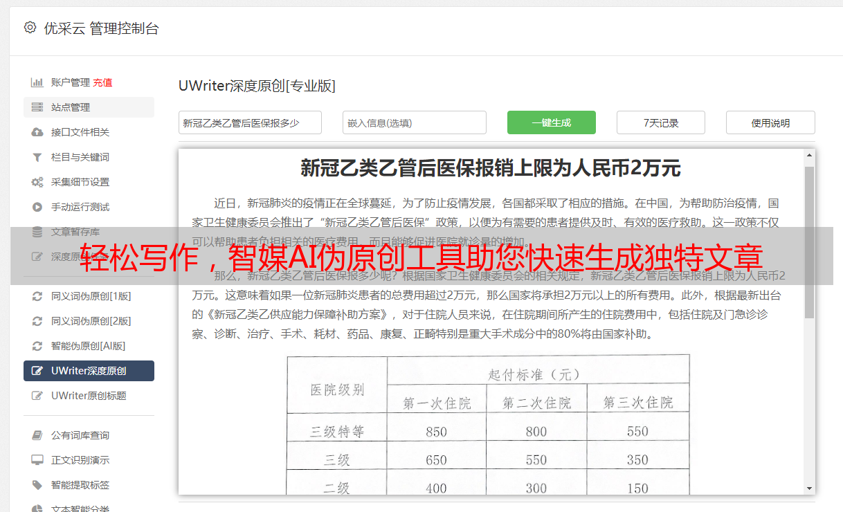 优采云 发布时间: 2024-01-04 20:36在这个高速运转的现代社会里,写作已悄然融入我们日常生活。然而,对不少人而言,这可能是项艰巨而又费时而无趣的工作。庆幸的是,我们拥有了智媒AI伪原创工具这个强大的助手,使得写作过程变得既简单又快捷。
