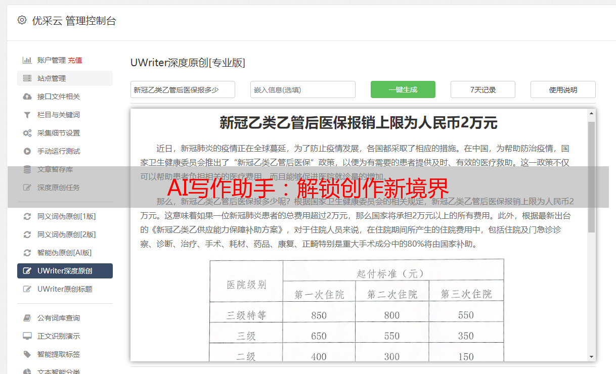 优采云 发布时间: 2024-01-04 22:29身为一位专注写文多年的作者,我深深感受到写作之路充满挑战与问题。然而,从我开始接触人工智能(AI)生成文章的神器以来,这一切都变得完全不同。今日,我愿意在此分享关于利用AI辅助创作的实践经验与感悟,期望能为广大热爱写作的同仁带来些许启示。