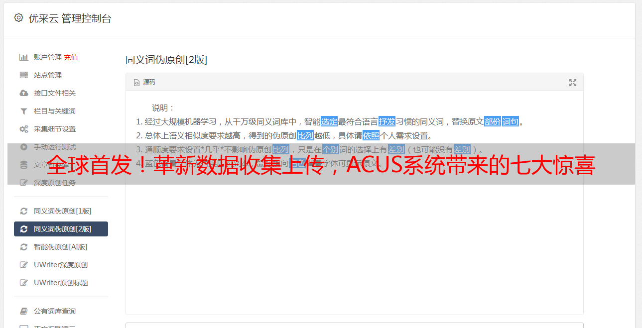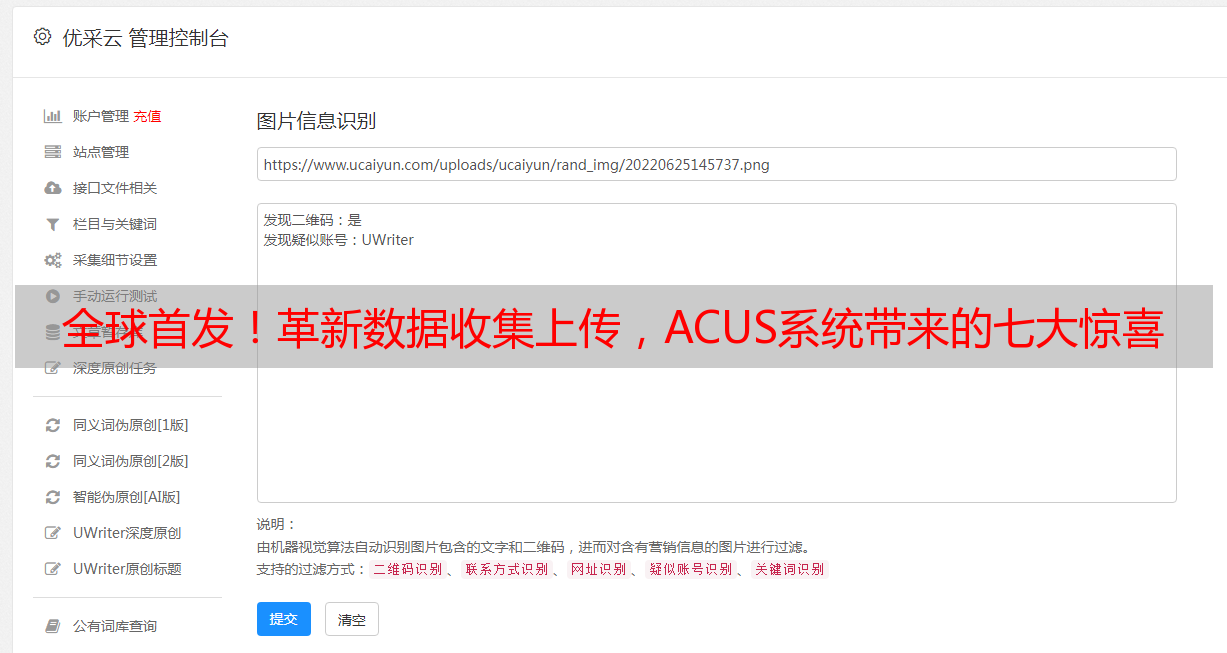 优采云 发布时间: 2024-01-05 03:51近日,我们自豪地向您介绍全球首发的自动采集上传系统(ACUS)。这项突破性的新技术将革新传统的数据收集和上传模式,为各类型的企业及个人带来更高效、便捷的体验。