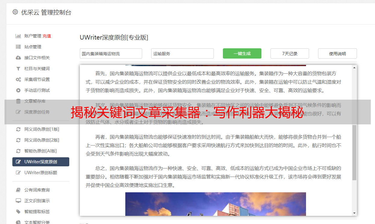 优采云 发布时间: 2024-01-07 01:45在下在写作生涯中,关键词文章采集器是值得信赖的得力助手。其方便快捷地协助我挖掘丰富而奇特的文章主题。接下来,请允许我分享使用此设备的心得体会。