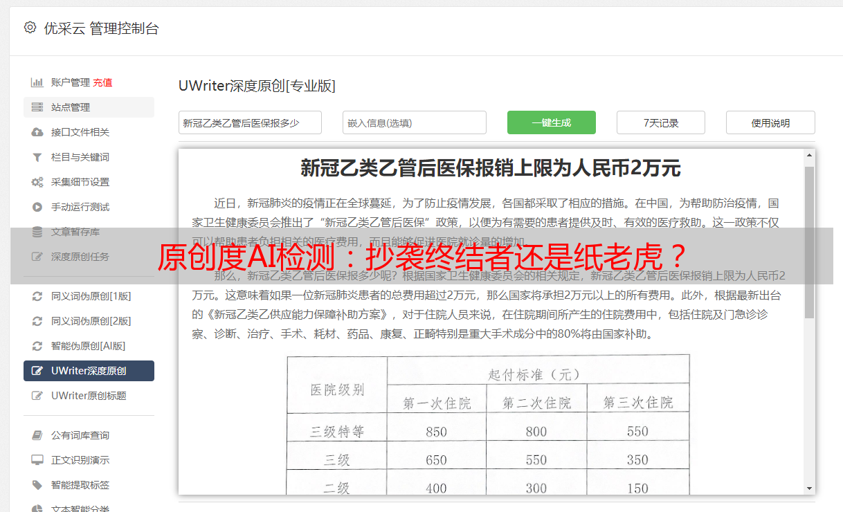 优采云 发布时间: 2024-01-08 20:48当今社会资讯如潮水涌动,各种文章和信息铺天盖地。然而,伴随着这股浪潮的,却是众多涉及抄袭与剽窃的问题,给学术领域及知识产权保护带来重大挑战。AI技术在此背景下登场,文章原创度AI检测也引起了广泛关注。作为一位有丰富经验的编辑,我希望借此机会分享所学和感知,期望能为各位提供一些启示。