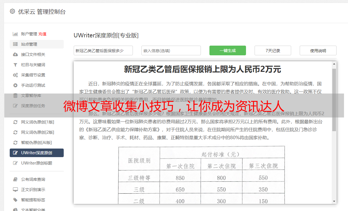 优采云 发布时间: 2024-01-09 01:56微博已然成为我们日常生活中的重要组成部分,这里有海量的新闻、文化以及娱乐资讯供我们浏览。在此,作为一位对于新浪微博使用熟练的博主,愿意与诸位共享本人在微博文章收集上的一些心得及小技巧,期望能为您提供些许助益。