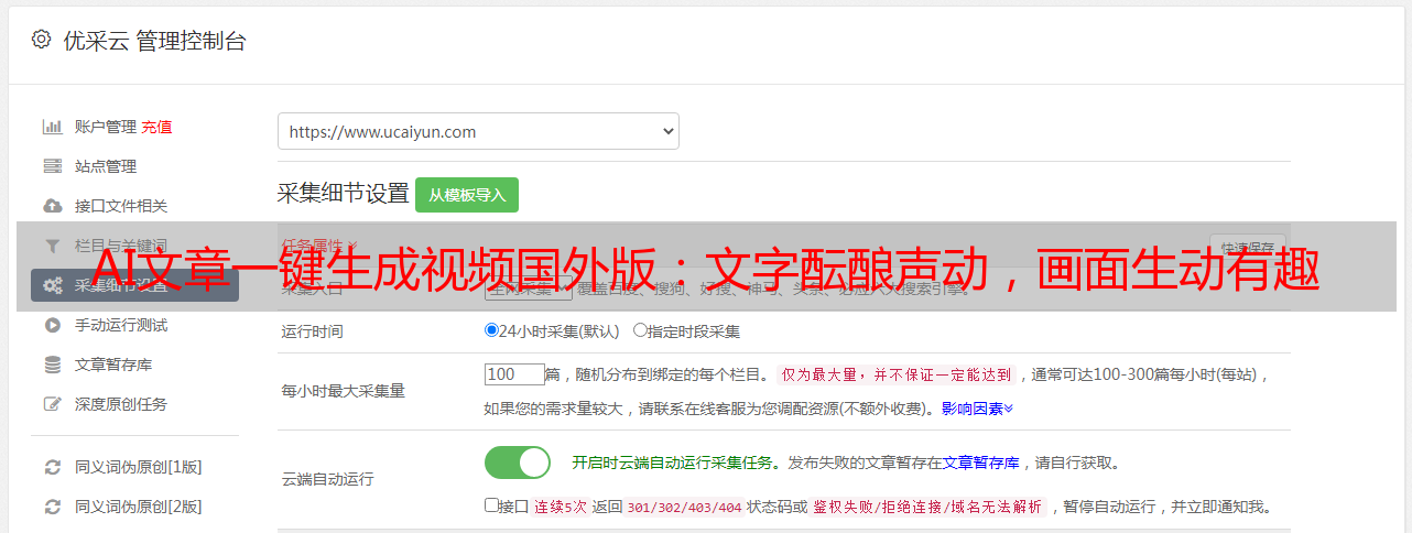 优采云 发布时间: 2024-01-09 17:33身为科技爱好者,我对人工智能有着莫大的兴趣和热情。近期,得以亲身体验了名为“ai文章一键生成视频国外”的出色工具,让我对人工智能的潜能有了更深刻的理解与认知。
