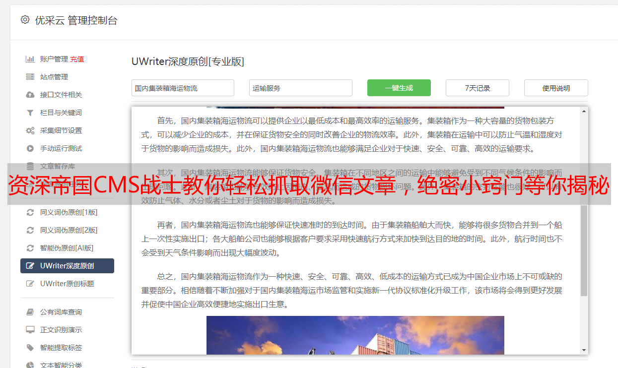 优采云 发布时间: 2024-01-10 22:25身为资深帝国CMS战士,我在利用此系统实现微信文章收集上有着丰富的心得。在此,特地公开一些实用的帝国CMS微信文章抓取小窍门与务必留意的地方,希望对您有所帮助。