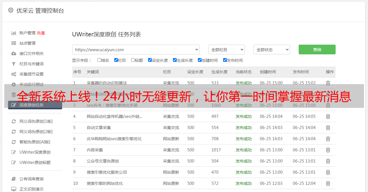 优采云 发布时间: 2024-01-11 16:19在信息化迅猛发展的今日,资讯与新闻得到了广泛关注。为此,近期我们创新性的新闻媒体网站特此上线了全新的自动化采集发布系统。此系统具备强大功能,能够自动收集各类新闻和资讯,且能以高效、精准的方式投放到我们的平台上。