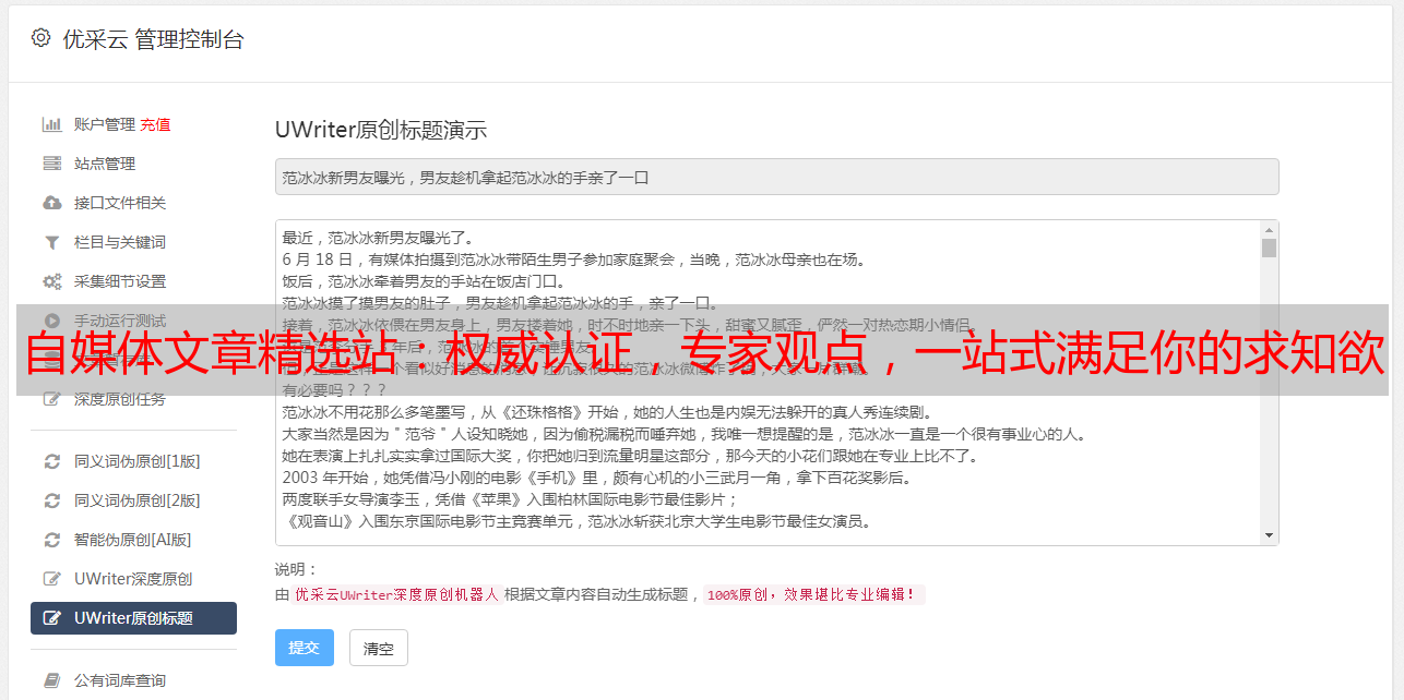 优采云 发布时间: 2024-01-11 16:50现在,自媒体已成为了信息传播的主要方式,尤其是以新闻媒体尤为突出。当然,面对各类平台每日涌现的新闻信息,我们要怎么才能筛选出真正有价值、真实可信的内容呢?无需烦恼,今日特为大家推荐一个涵盖了丰富自媒体文章的精品网站——自媒体文章采集站。