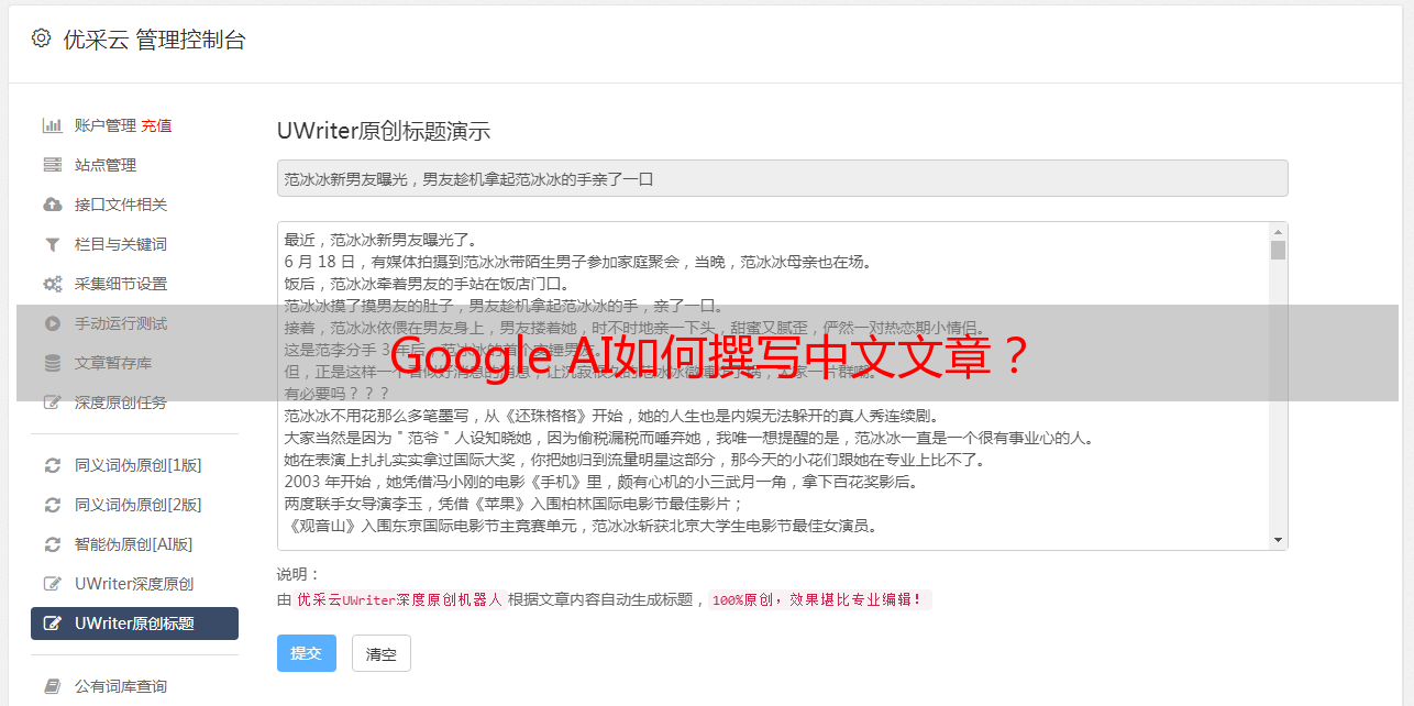 优采云 发布时间: 2024-01-12 02:24近期,Google AI 撰写中文文章引发了热烈讨论。鄙人作为科技狂热爱好者,愿站在多重视角为各位答疑解惑。