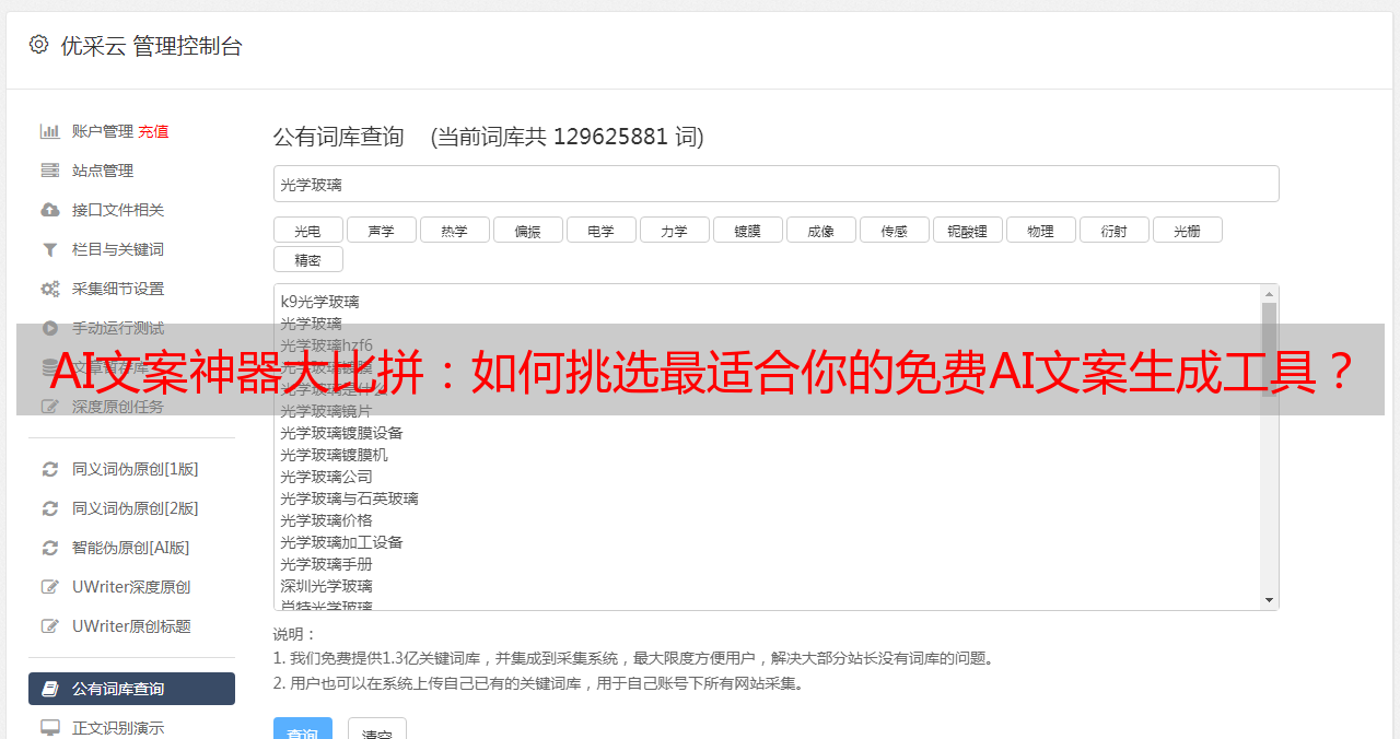优采云 发布时间: 2024-01-16 09:53随着人工智能技术的日益精进,AI文案的用途也越发普及。目前市场上已有不少免费的AI文案生成神器,大大减轻了大家的写作负担。然而,面对繁杂多样的选项,如何筛选出最合适的那款呢?请允许我帮您从多维度综合考察,助您挑到最得心应手的免费AI文案生成工具。