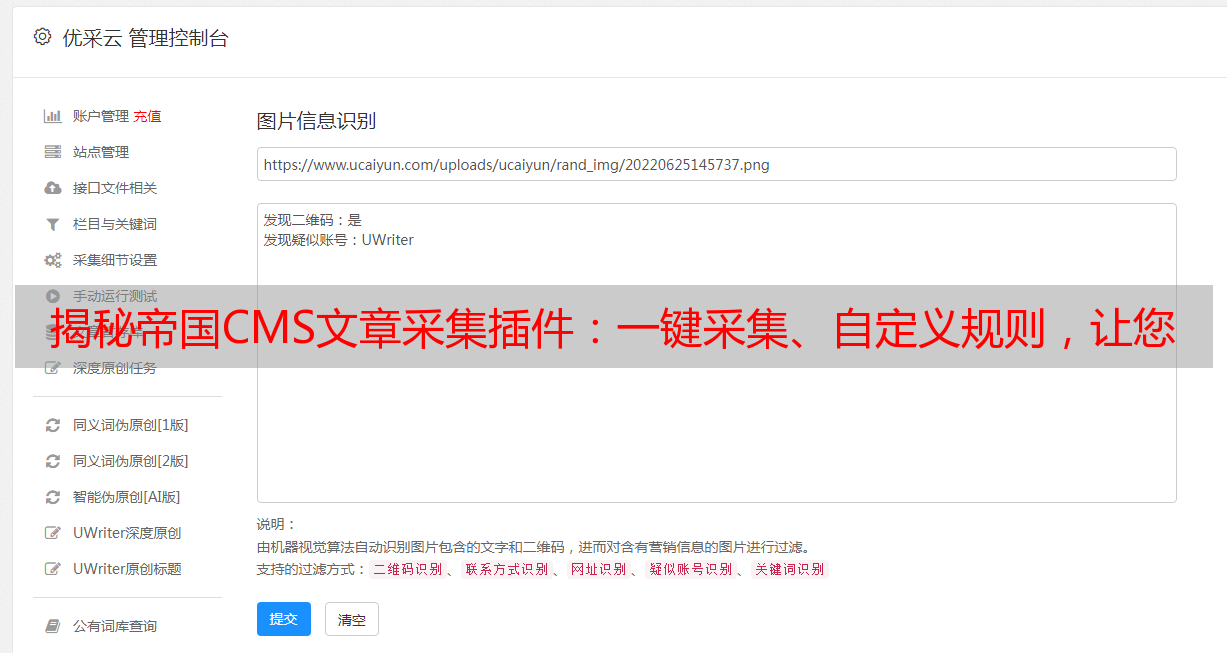 优采云 发布时间: 2024-01-19 18:42尊敬的朋友们,您或许正寻找这样一款功能强大的工具——帝国CMS文章采集插件。这是您网站内容丰富度的绝佳助力,其智能采集、精准分类的特点将给您带来前所未有的方便。接下来,我将带大家更加细致地了解这款神器级插件,敬请期待!