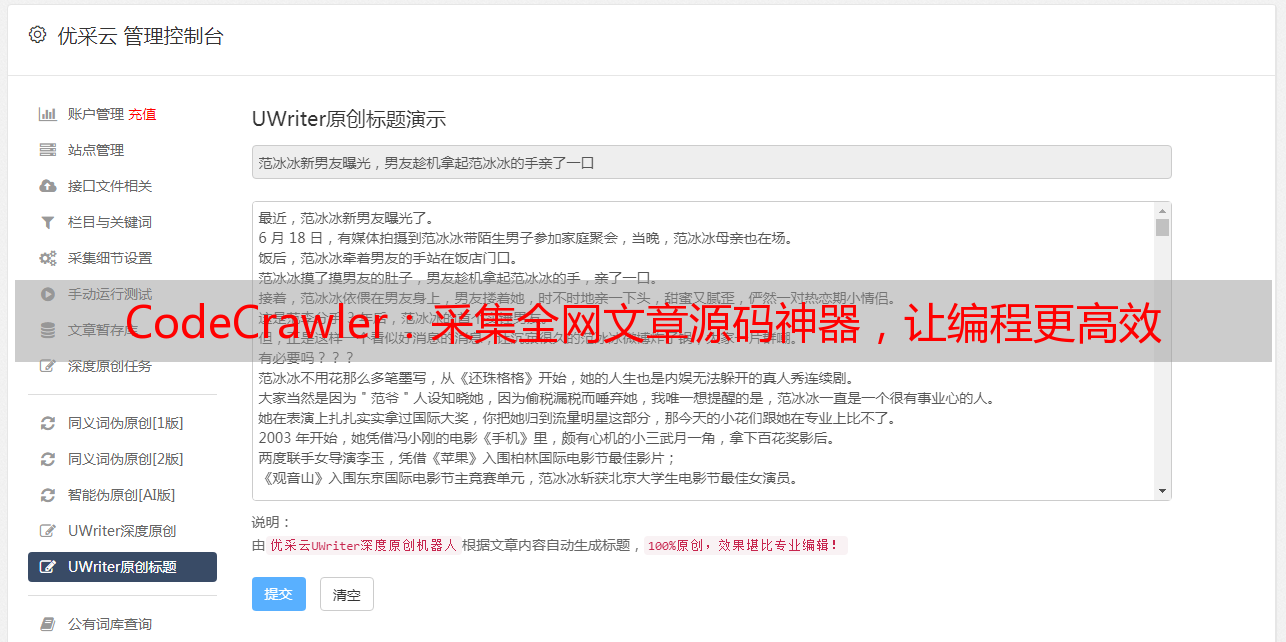 如您对此款神器——CodeCrawler有所兴趣,欲深入了解及使用其全网文章源码采集功能,恭请移步至本人官网www.codecrawler.com,在此您可方便地获取并享用这款免费软件。当然,我司还为您提供详尽的使用指南与技术支持,助您更好地上手这款强大工具。