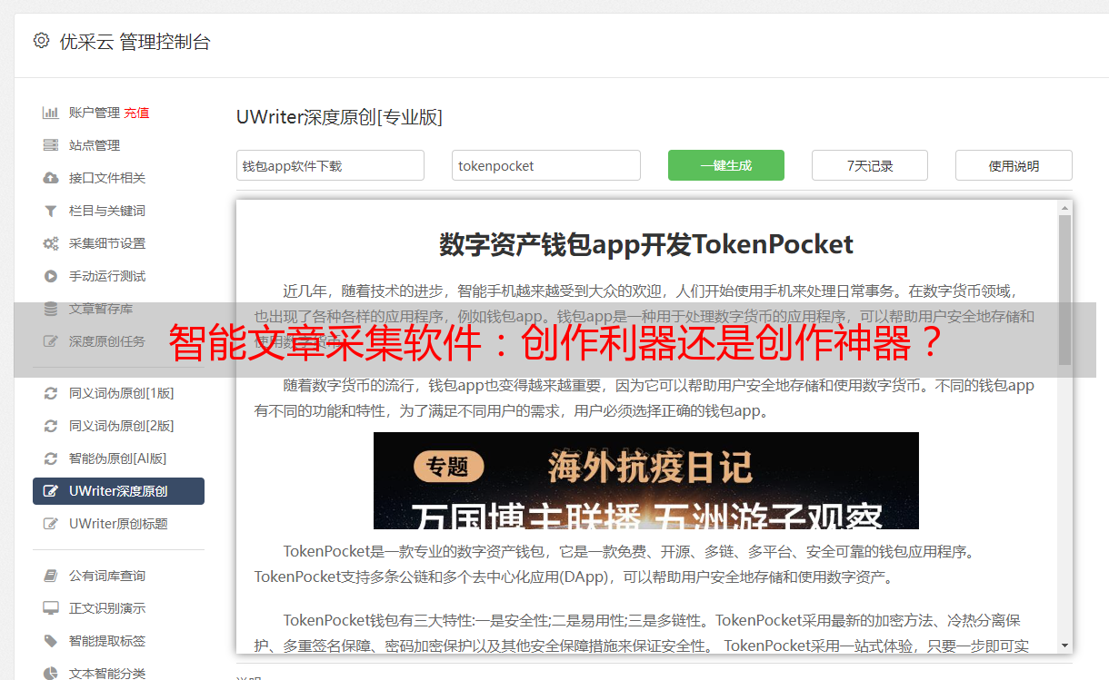 尊敬的读者朋友们,这里是我关于智能文章采集工具的几点心得体会。希望这些小妙招能为您的创作带来便利,提高效率。请您放心,借助此款神器,创作将变得轻而易举且充满乐趣。此刻就请行动起来吧!祝愿大家都能成为出色的内容创造者!