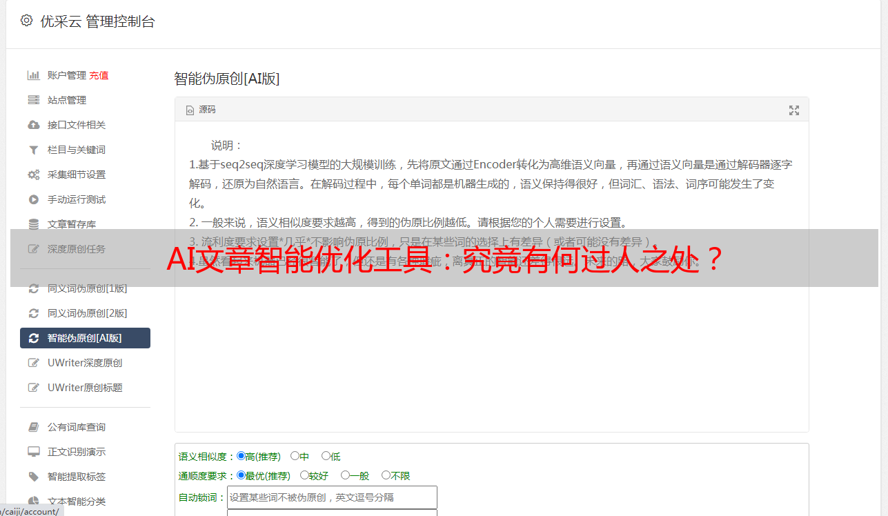 优采云 发布时间: 2024-01-23 23:16身为一位编辑,对写作的真谛及所面临的种种困难了然于心。每日均需应对众多文案和各式需求,如何迅速且高效地递上优质的作品,成为了我亟待攻破的难关。然而,近期遇见一款名叫“AI文章智能优化工具”的软件让人眼前一亮,声称能助写作者提升创作效率与文学素养。因此,我决心对这款产品与市面上同类产品进行对比测评,探寻它究竟有无过“人”之处呢?