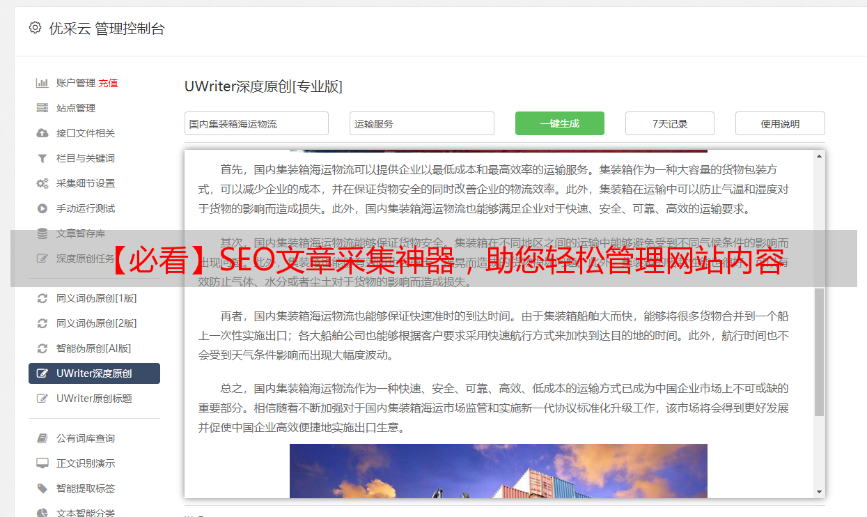 优采云 发布时间: 2024-01-24 06:37现在网络技术日新月异,各行业均开始认识到网站流量的重要意义。为了提升网站流量,搜索引擎优化(SEO)方法已经成为广大从业者们热衷使用的首选。作为一名在 SEO 领域深耕多年的专业人士,我非常愿意与诸位分享一款个人非常推崇的 SEO 文章采集神器,希望能为您带来帮助。