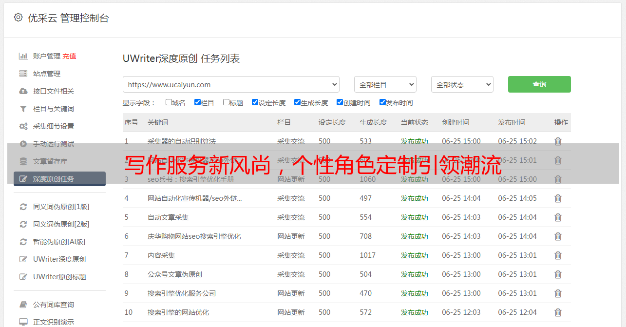优采云 发布时间: 2024-02-03 16:58本站自创立伊始,便全心全意为每位用户提供量身定制的写作服务,助力各位轻松谱写出优美佳作。身为此旗舰站点的缔造者,在下感到无比荣耀,在此向您揭晓一些针对本站主要功能及服务的详细信息。