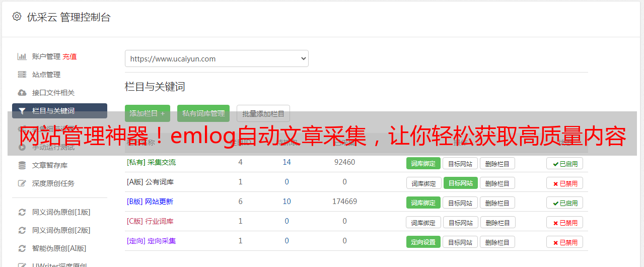 优采云 发布时间: 2024-02-04 12:53尊敬的读者们,您们好!在此我们向您推荐一款名为"emlog自动文章采集"的实用插件,它能协助网站管理人员迅速、有效地收集和发布丰富的高质量内容。身为资深网管,我本人对其诸多优点深感钦佩与欣赏。接下来,我愿就此插件的七大特性做一番详尽而又务实的讲解。